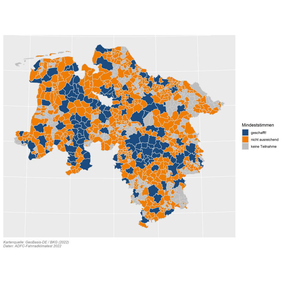 Der große ADFC-Fahrradklima-Test hat in diesem Jahr mit einer Rekordteilnahme abgeschlossen. Mit 138 Orten (Stand 1.12.) haben es in Niedersachsen 27 Prozent mehr Orte in die Wertung geschafft als 2020.